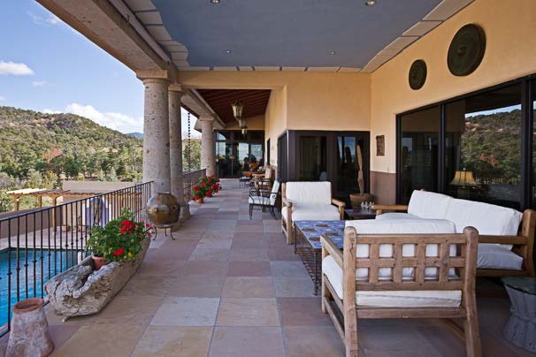 Santa Fe is known for many great things, not the least of which is its unique architecture. Recently added to New Mexico’s most fabulous homes and estates is Hacienda de Las Hermanas, located in Tesuque Ridge Ranch, a preeminent gated community in Santa Fe’s prestigious north side. Hacienda de Las Hermanas is truly Santa Fe’s greatest Mexican hacienda estate property. From the numerous grand portals, the views of the Sangre de Cristo and Jemez Mountain ranges will steal your breath away. From the outdoor kitchen, adjacent to the expansive swimming pool, windows to the world reveal San Antonio Peak on the distant Colorado border.