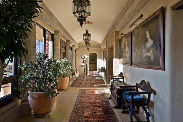 As you begin the enchanted drive along the meandering entrance dotted with dramatic boulders and cut stones, your sense of anticipation builds with each curve along the route. Soon the elegant parking court comes into view and huge classic gates beckon you to the walled garden and central courtyard fountain, where you pause to take in the inset stone block carvings of animals and geometry in addition to the massive Cantera stone cross that serves as a stunning finial to the highest point of the Hacienda’s gracious rooftop.