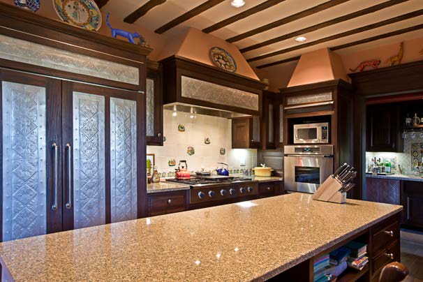 Entering through the hand carved doors of the Hacienda, a warm and spacious gallery embraces you for the moments before you pass through the smoothly carved Cantera doorway surround that welcomes you to the heart of the home. This extraordinary hacienda was designed for elegant entertaining as well as casual gatherings around any of the numerous fireplaces, luxuriating in one of the three gracious bedroom suites, or brainstorming in the stately office replete with custom, zebra wood cabinetry. Wherever you wander on the main level, your eyes are continually drawn beyond the oversized windows framing Mother Nature’s majesty, to unobstructed views and endlessly changing skies. Custom and hand crafted décor is evident throughout this colonial estate. Cedar lined closets, hand-adzed beams, latillas and traditional wooden vigas, hand forged wrought iron railings and hardware, floors of Portuguese limestone in public areas, fine woolen Berber carpet in the bedrooms, quarry tile and walnut tongue and groove floors set off antique wooden Mexican doors, gates and hand made nichos. Noteworthy craftspeople include Maurice Dixon, who skillfully punched tin to grace numerous surfaces in the kitchen, wet bar and baths; Pamela Platt, who waved her magic paintbrush on soft walls that beg to be touched and applied classic Mexican accents that set off faux finishes and dramatic ceiling textures; Gorky tile designs, that are featured in spacious bathrooms and intimate corners throughout the home.